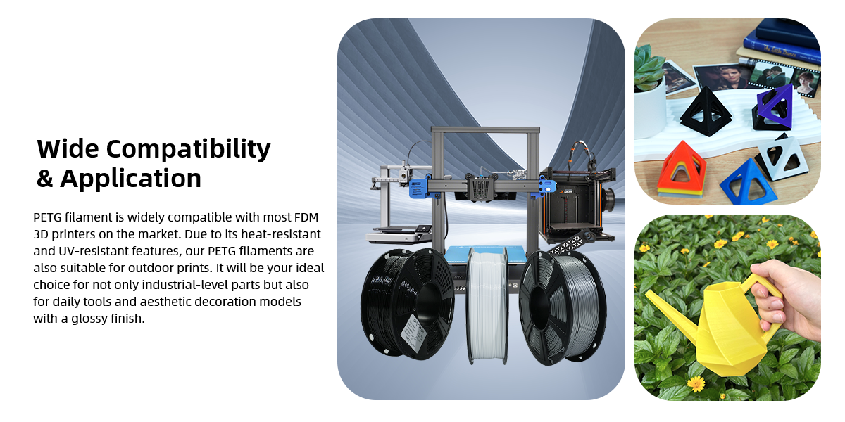 ăPETG FILAMENTă PETG filament offers stiff, durable strength (like ABS) and ease of use (like PLA)âno heating bed needed, equipped with good gloss, corrosion resistance.ăTOLERANCE ± 0.03mm ă PETG 1.75mm 3D printer filament are produced with more precise specification, and have a tolerance of only +/- 0.03 mm. Compatible with MOST FDM 3D printers.